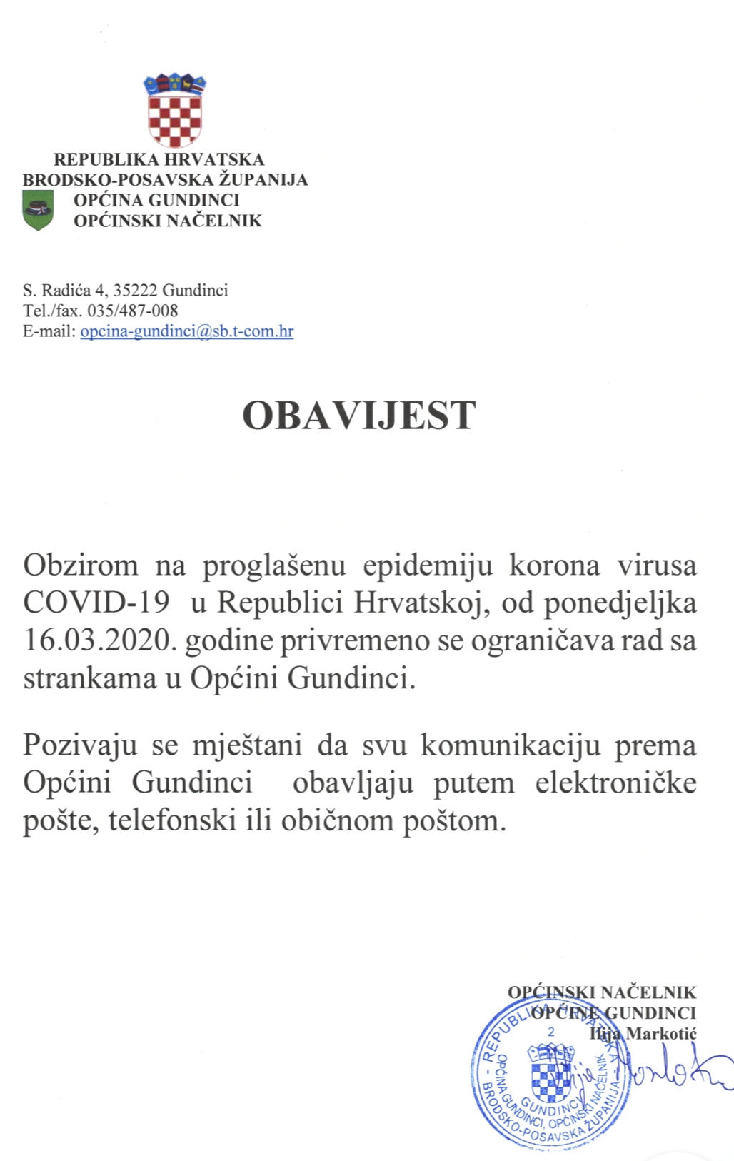 Početna|Nekategorizirano|Privremeno se ograničava rad sa strankama u Općini Gundinci