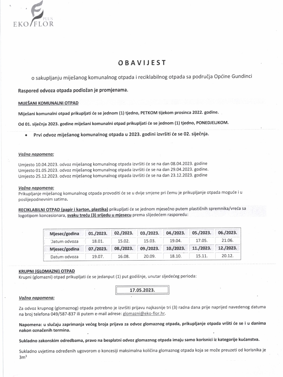 Početna|Nekategorizirano|OBAVIJEST o sakupljanju miješanog komunalnog otpada i reciklabilnog otpada na području Općine Gundinci