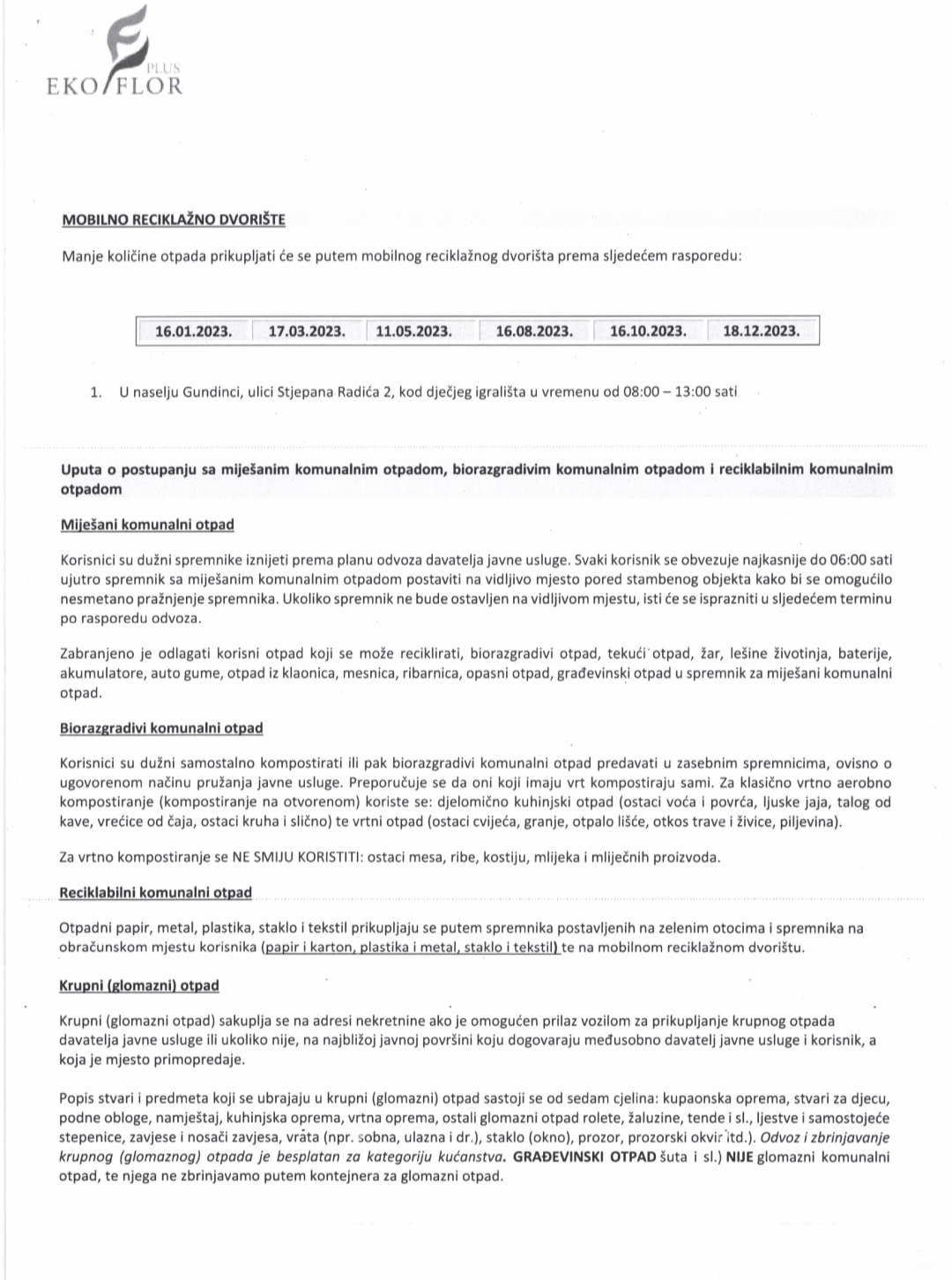 OBAVIJEST o sakupljanju miješanog komunalnog otpada i reciklabilnog otpada na području Općine Gundinci