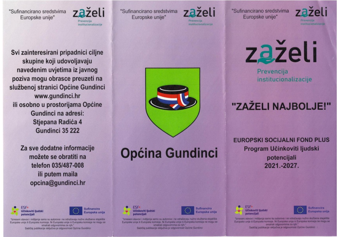 Projekt Zaželi – Prevencija institucionalizacije je nacionalni program sufinanciran iz Europskog socijalnog fonda plus (ESF+) koji općina provodi radi pružanja podrške najosjetljivijim skupinama u lokalnoj zajednici. Glavni ciljevi projekta su: Povećanje socijalne uključenosti ranjivih skupina osiguranjem skrbi, potpora i podrška starijim i invalidnim osobama kako bi im se poboljšala kvaliteta života. Trajanje projekta je 36 mjeseci, a provodit će se na području općine Gundinci.